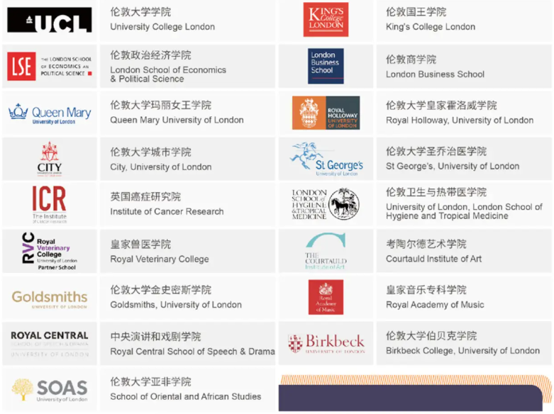 伦敦大学作为世界最大的学院制大学之一,旗下名校云集,包括伦敦政经(LSE)等代表英国最高学术水平的G5大学,也有伦敦国王学院、玛丽女王学院等英国罗素集团大学,还有像皇家音乐学院、圣乔治医学院等小而精的专业学院,可提供超过13,000个专业选择。伦敦大学旗下各个学院都有独立的大学地位和高度的自治权,在各项学术指标和排名中均名列前茅、这些大学互为独立又互相联系。